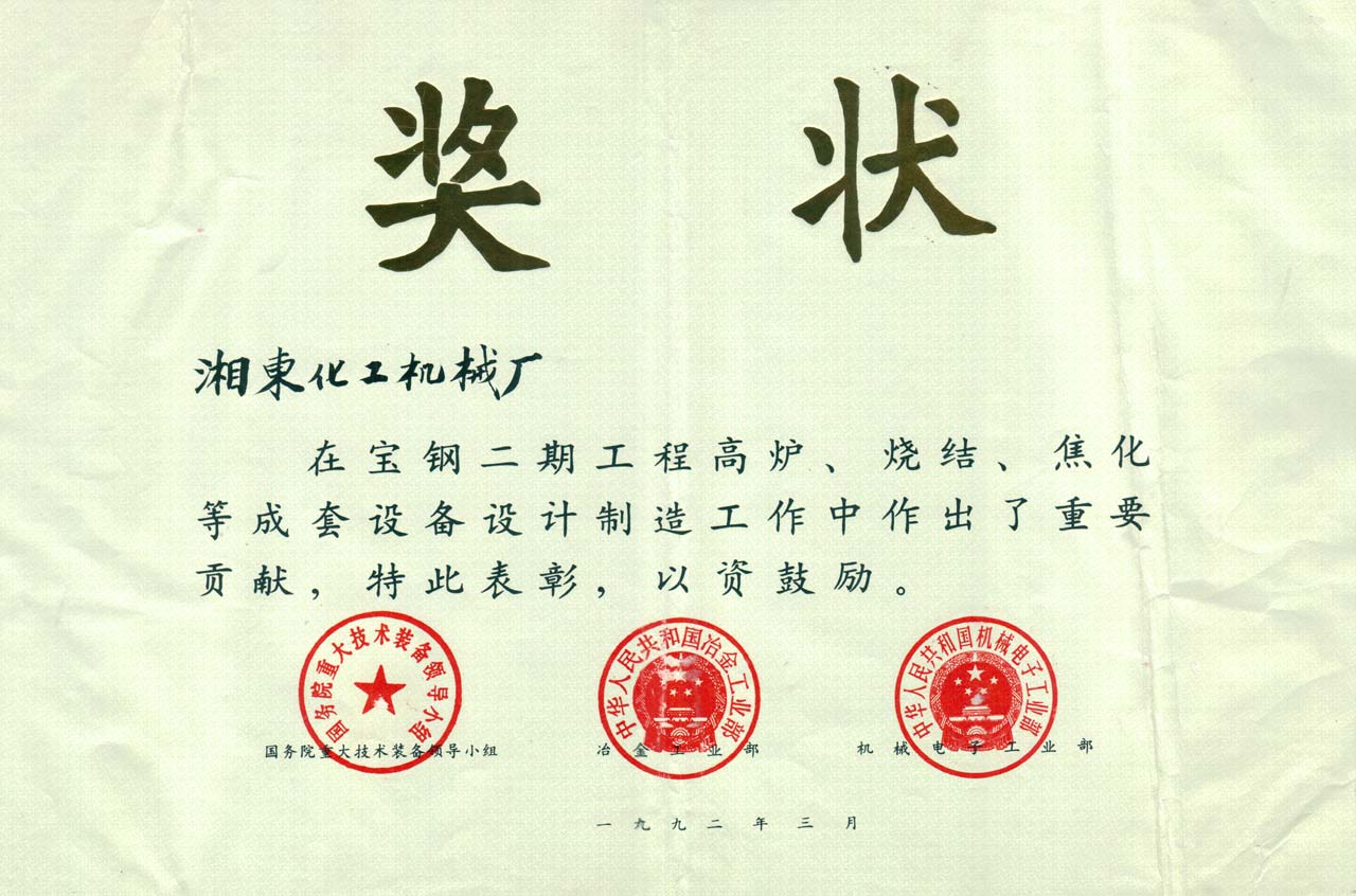 寶鋼二期工程高爐/燒結(jié)/焦化等成套設(shè)備獎(jiǎng)狀