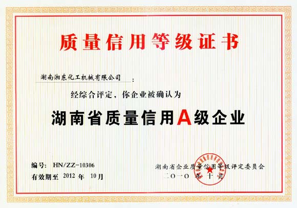 企業(yè)質(zhì)量信用等級(jí)分為A、B、C、D四等,分別代表守信、基本守信、失信和嚴(yán)重失信。湘東化機(jī)被評(píng)定為質(zhì)量信用A級(jí)企業(yè),代表著公司在不斷發(fā)展的過(guò)程中嚴(yán)把質(zhì)量關(guān),嚴(yán)格地遵守國(guó)家的相關(guān)政策和規(guī)定,遵守信用,在客戶心中形成了良好的企業(yè)形象。