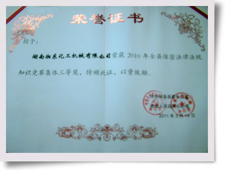 2011年3月17日,從攸縣縣委辦公室、攸縣人民政府辦公室傳來喜訊,我公司在2010年11月30日進(jìn)行的全縣保密法律法規(guī)知識(shí)競(jìng)賽中榮獲集體三等獎(jiǎng),獲得縣委、縣政府的表彰。