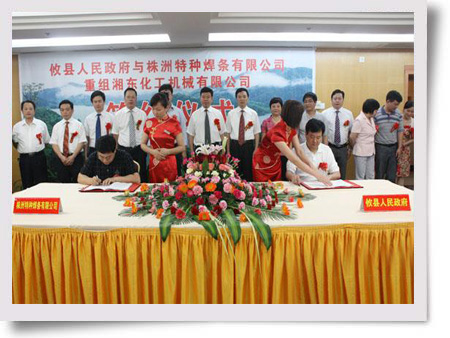 2011年6月2日,湘化機(jī)迎來了歷史性的一天。全體職工期盼已久的重組歷經(jīng)七年,終于在今天取得成功。株洲特種焊條有限公司在與攸縣人民政府多次磋商后,正式簽訂了重組湘化機(jī)的協(xié)議。 簽約儀式上,株洲特種焊條有限公司總經(jīng)理曾繼疆首先發(fā)言,對來到攸縣感到榮幸,表達(dá)了重組湘化機(jī)的決心和信心,表示將盡快把湘化機(jī)帶出困境,并為攸縣經(jīng)濟(jì)發(fā)展作出自己的貢獻(xiàn);湘化機(jī)董事長兼總經(jīng)理蘇成隨后表態(tài):公司領(lǐng)導(dǎo)班子和全體職工將以更飽滿的熱情、更努力的工作,把湘化機(jī)做大做強(qiáng),爭創(chuàng)化機(jī)行業(yè)一流,帶動(dòng)攸縣縣域經(jīng)濟(jì)的發(fā)展;攸縣縣委書記鄺鄒飛最后發(fā)言,對曾總重組湘化機(jī)表示了感謝和敬意,并請?jiān)偰芗芯拓?cái)力,按照“三年五個(gè)億,五年十個(gè)億”的目標(biāo),把湘化機(jī)迅速做大做強(qiáng)。同時(shí),要求攸縣各相關(guān)部門對于湘化機(jī)下一步的工作必須不遺余力地予以支持,優(yōu)化企業(yè)發(fā)展環(huán)境,共同把湘化機(jī)打造成全國一流的化工裝備制造企業(yè)。 重組之后,制約公司發(fā)展的資金問題將會(huì)徹底解決,正是大展拳腳的機(jī)會(huì),各項(xiàng)工作將緊張有序地全面展開。全體職工要改變精神面貌、轉(zhuǎn)變觀念,一切以效率為先,齊心協(xié)力,再創(chuàng)湘化機(jī)的輝煌。