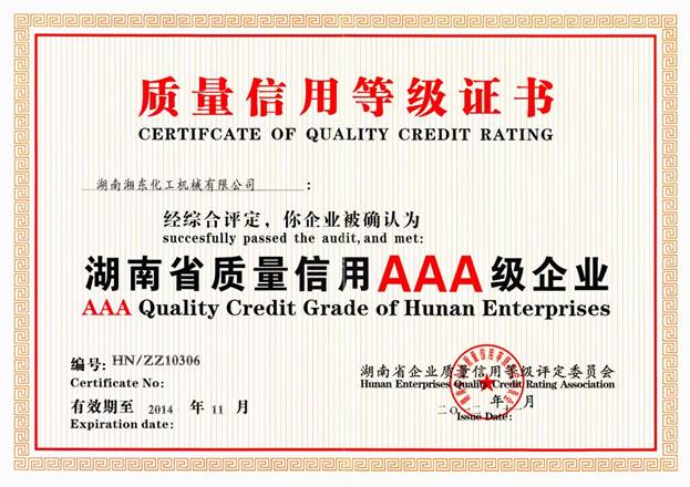 企業(yè)質(zhì)量信用等級評定活動由省質(zhì)量技術(shù)監(jiān)督局、省社會信用體系建設(shè)領(lǐng)導(dǎo)小組辦公室及省信用建設(shè)促進(jìn)會聯(lián)合開展。2012年9月,湘東化機(jī)向省企業(yè)質(zhì)量信用等評辦提交“省質(zhì)量信用AAA級企業(yè)”申報材料并順利通過了文件初評,10月30日,省企業(yè)質(zhì)量信用等評辦評審專家組對湘東化機(jī)進(jìn)行了現(xiàn)場評定,評審組在根據(jù)公司的經(jīng)營狀況、標(biāo)準(zhǔn)化管理和企業(yè)標(biāo)準(zhǔn)體系建設(shè)情況、計量管理和計量檢測體系建設(shè)情況、企業(yè)售后服務(wù)體系建設(shè)及消費者意見反饋情況、合同履行情況、完稅情況、產(chǎn)品質(zhì)量情況(如產(chǎn)品監(jiān)督抽查結(jié)果、各種質(zhì)量認(rèn)證情況、采標(biāo)情況等)及近3年內(nèi)企業(yè)規(guī)范經(jīng)營及獎懲情況,依據(jù)“公正、客觀、科學(xué)”原則,在對公司和產(chǎn)品進(jìn)行全面了解、考察調(diào)研和分析的基礎(chǔ)上,對公司質(zhì)量信用行為的可靠性、安全性程度作出綜合評價,最終經(jīng)評審組討論認(rèn)定,湘東化機(jī)符合質(zhì)量信用最高等級——AAA級企業(yè)評定要求,順利通過評定。