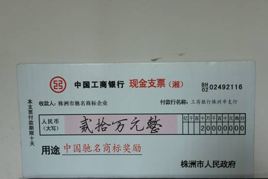 2013年9月6日,我公司參加了株洲市馳名商標(biāo)表彰大會(huì),我公司因2012年獲“中國馳名商標(biāo)”受到通報(bào)表彰。(《株洲市人民政府辦公室關(guān)于表彰我市被新認(rèn)定為2011-2012年中國馳名商標(biāo)、湖南省著名商標(biāo)企業(yè)的通報(bào)》株政辦函[2013]85號(hào)),會(huì)上,我公司捧回“中國馳名商標(biāo)”牌,并受到株洲市人民政府給予表彰企業(yè)的20萬元獎(jiǎng)勵(lì)金。