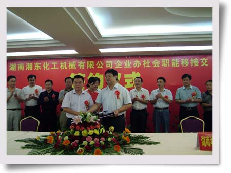 湘東化機董事長兼總經(jīng)理蘇成對攸縣人民政府接收企業(yè)辦社會職能管理表示感謝。歷經(jīng)38年的企業(yè)辦社會職能----職工退休管理、自制自來水、勞動服務公司(正在履行破產(chǎn)程序)、子弟學校(2005年已移交)、生活區(qū)自供電(已移交)圓滿劃上句號,企業(yè)從此輕裝上陣,為地方經(jīng)濟發(fā)展作出更大的貢獻。